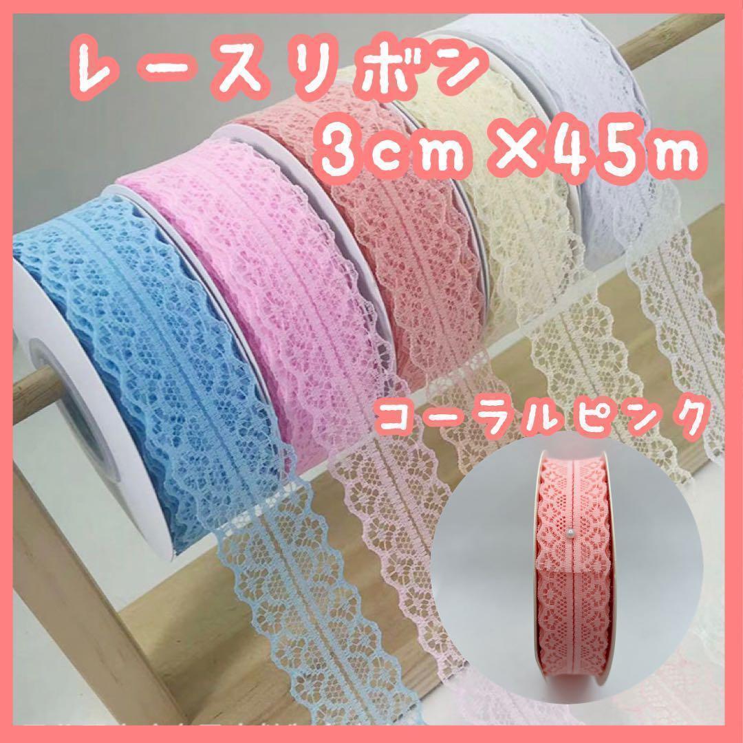 - ハンドメイド レースリボン コーラルピンク 3㎝×45m 洋服 人形 花束ブーケ コーラルピンク
