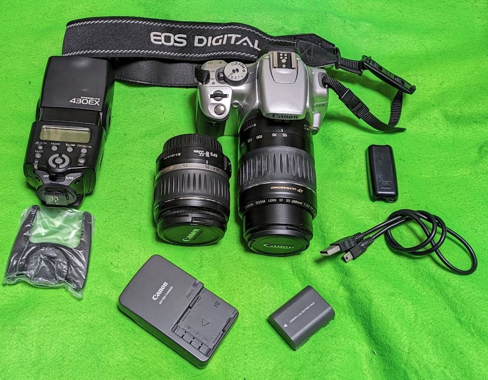 - 【中古・送料無料】CANON EOS Kiss Digital X ■レンズ2本■ EF-S18-55ⅡU EF55-200Ⅱ 430EX 純正ソフトケース