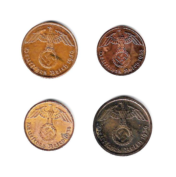 - ドイツ 第三帝国 (鉤十字) - 1, 2, 5, 10 ライヒスペニヒ/青銅貨 黄銅貨★ZD-8