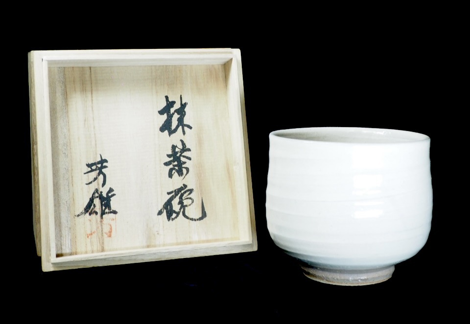 - ビンテージ 茶道具 芳雄作 白釉茶碗 抹茶碗 在銘品 共箱付 1990年代 CKY512