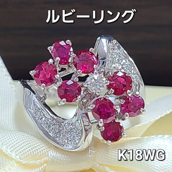 - 【鑑別書付】美しさにこだわった 天然 ルビー ダイヤモンド K18 WG ホワイトゴールド 18金 ウェーブ リング 指輪 7月誕生石