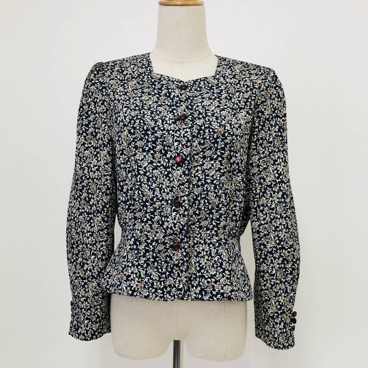 > k2539 美品 Sun Wind ブラウス 長袖 薄手 肩パット 韓国製 11AR ネイビー 花柄 レディース 上品 レトロチック エレガントガーリーチック