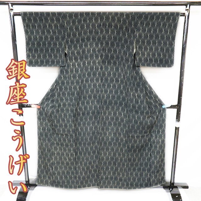 > 小紋 着物 中古 正絹 袷 カジュアル 銀座 こうげい たとう紙付き 一越ちりめん 錆鉄御納戸色 身丈160cm 裄63cm L きもの北條 A965-5