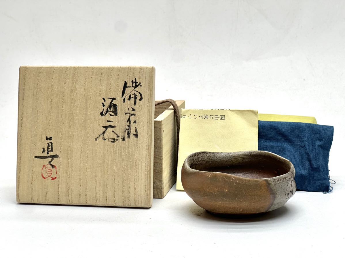 - 中村真 備前 赤かせ ぐい呑 共箱 共布 栞 父 中村六郎 酒器 ⑨