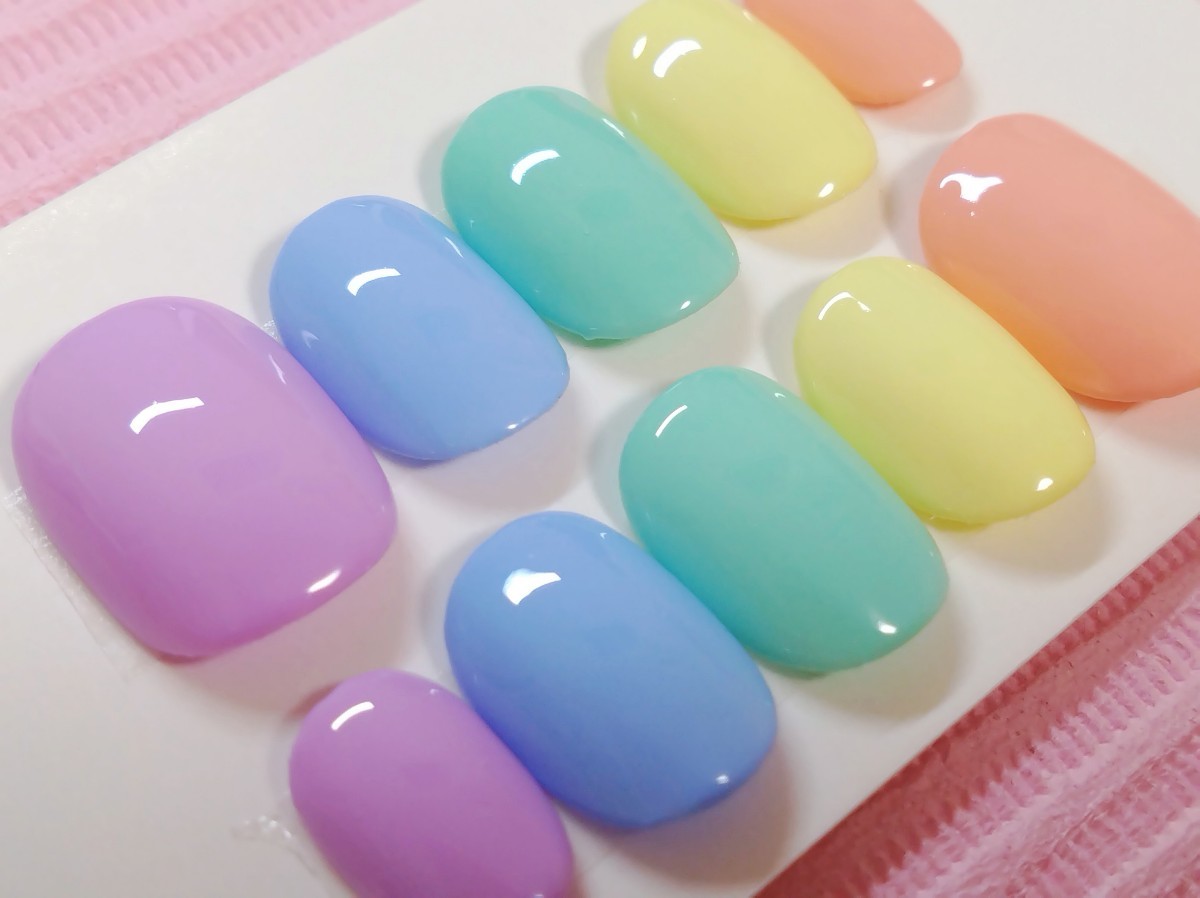 - 【ジェルネイル】Lサイズベリーショート・カラフルパステルカラーリングネイルチップ付け爪レインボー