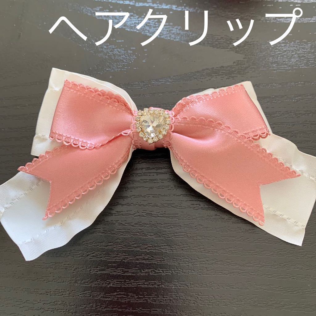 - 夢可愛い ロリータ ハート ビジュー ピンク×ホワイト リボン ヘアクリップ
