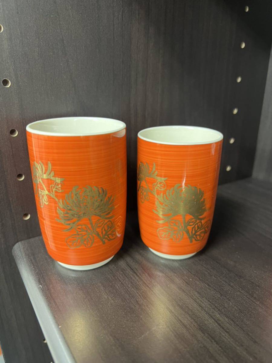 > 三越購入 高級 夫婦湯呑 湯のみ 茶器 一菊 赤地 金文字 金の菊の絵