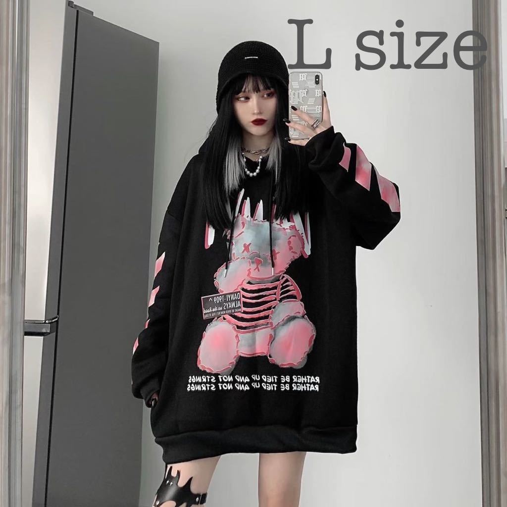 - パーカー ビッグシルエット トップス フード 長袖 プリント ユニセックス 男女兼用 黒 ブラック ベア くま L