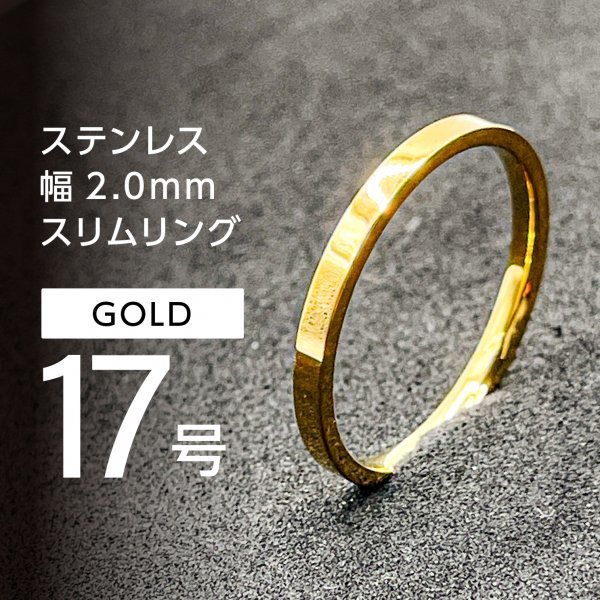 - J034 ステンレスリング 2mm平打ちリング ゴールドカラー 17号