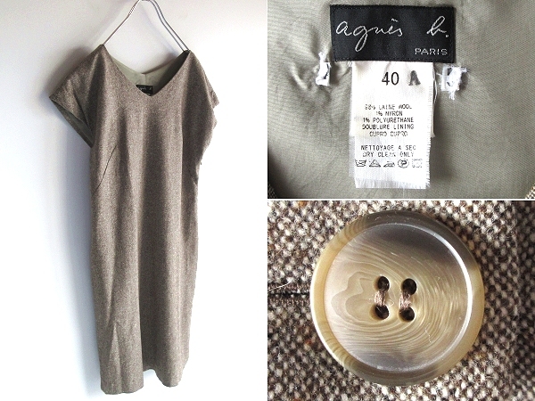 > 希少 ビンテージ agnes b. アニエスベー ストレッチ ネップウールツイード フレンチスリーブ ワンピース 40 ミックスグレージュ 日本製