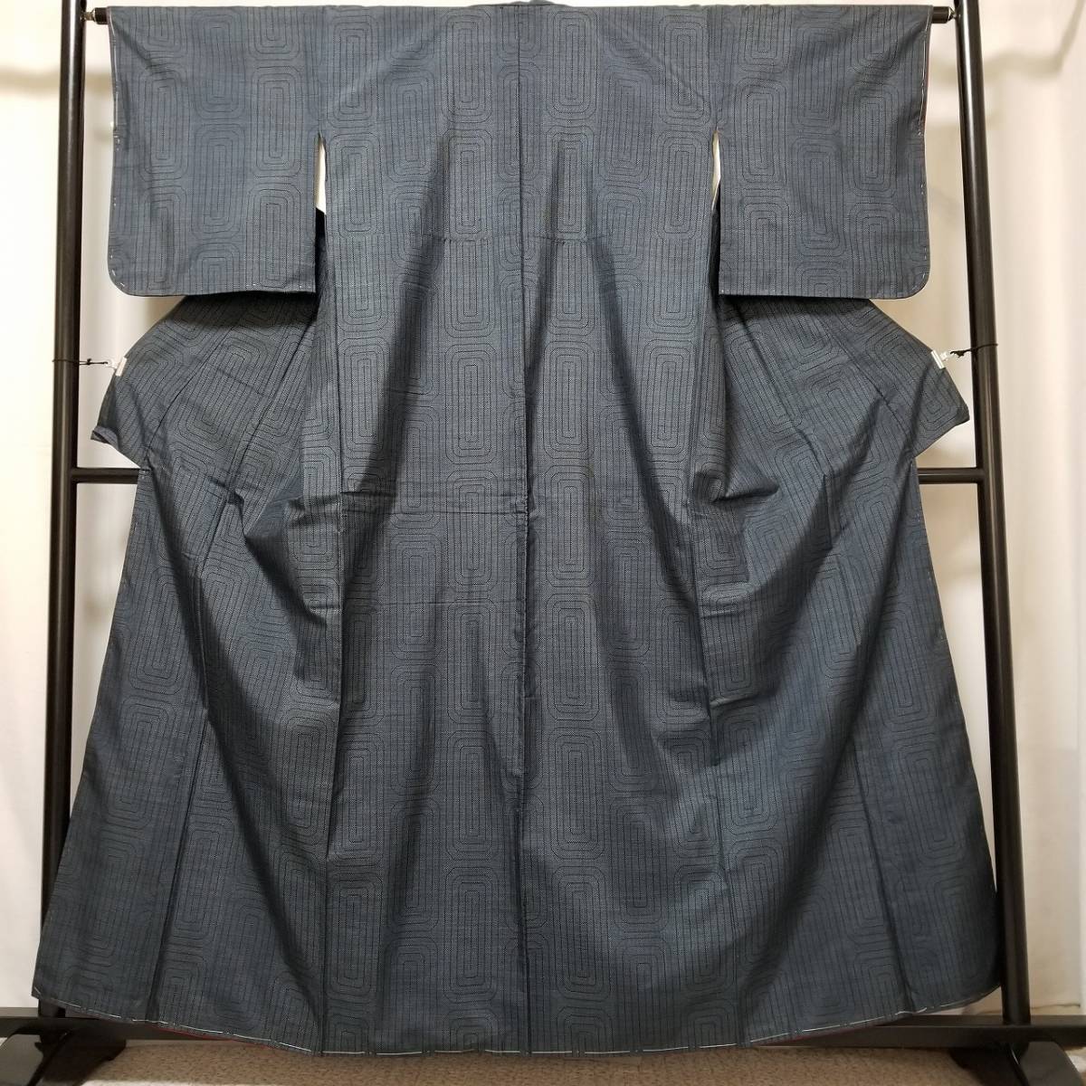 - 【桐徳】大島紬☆幾何文☆送料無料*未使用*仕付け糸付{正絹*本場奄美泥大島紬*袷着物}身丈162-裄64.5*黒地に藍色糸での幾何学文様*№6355