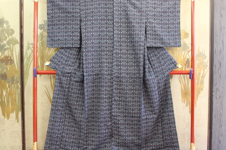 - きもの今昔6419 小紋のきもの 広衿袷仕立 大島柄風型打染 胴裏は緋の裏が付いています 仕付け糸付 身丈153cm