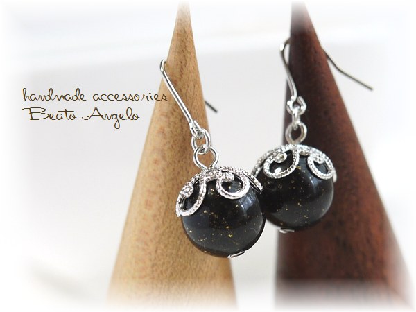 > ◆◆+angelo+ドイツビーズの一粒ピアス(p-061)ブラックフレーク S 花座 チタン 樹脂 イヤリング ※廃番