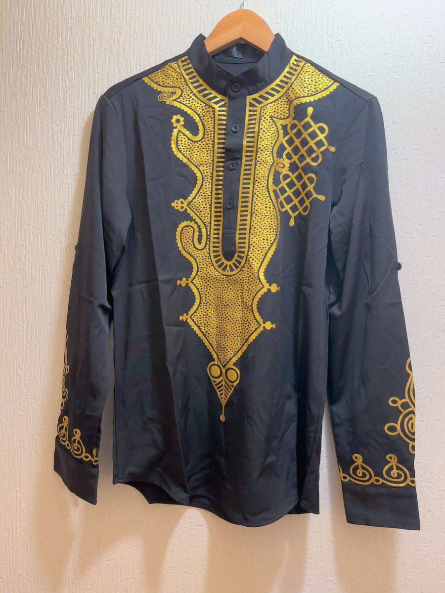 - 新品★ブラック★ゴールドのエスニック柄★民族風ブラック★シャツ★ユニセックス★L