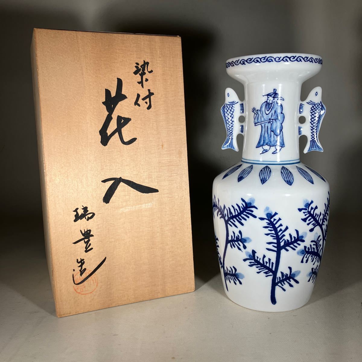 - 西尾瑞豊造 染付 花入 魚耳 888