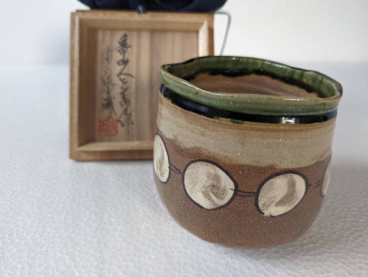 - 本物保証 北大路魯山人 織部 筒茶碗 無傷 黒田陶々庵識箱 未使用 本物返品OK 255