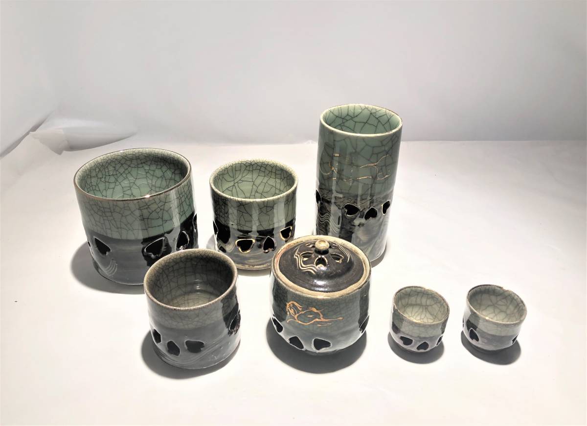 - X137●相馬亀田 相馬焼 古相馬 跳ね駒 走り駒 茶道具 茶碗 煎茶 ぐい呑 湯 二重焼き 酒器 豬口 陶器 磁器 茶碗蓋付き 金彩 在銘 現状品