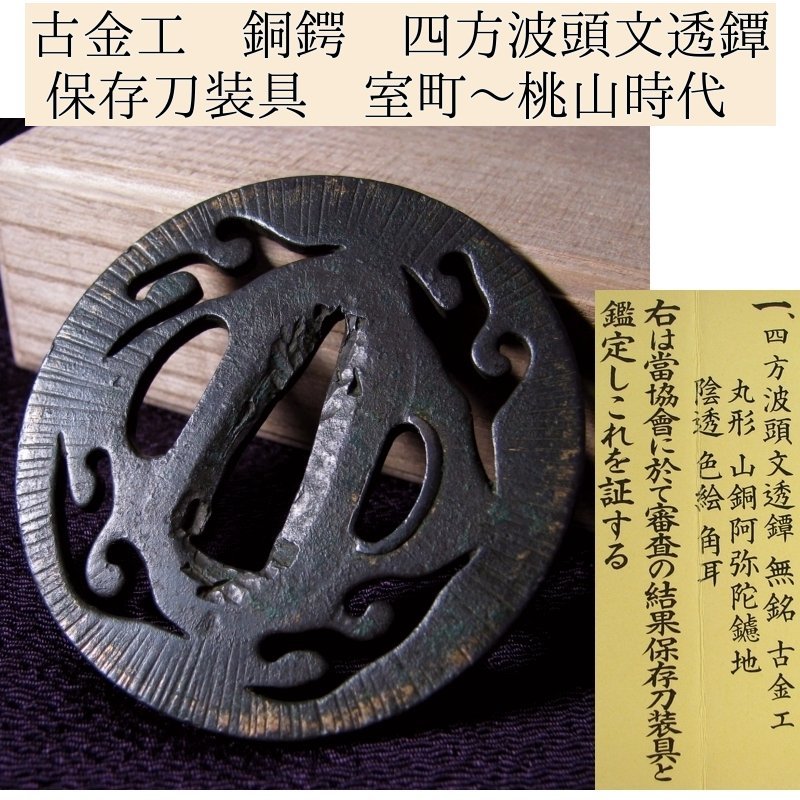 - 時代武具 山銅製鍔 古金工 保存刀装具鑑定書・桐箱付 四方波頭文透鐔 室町~桃山時代/鐔/24b067