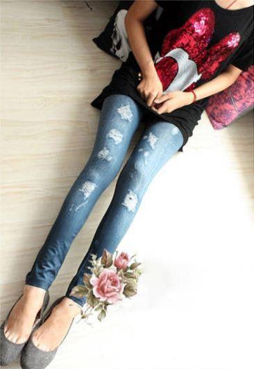 - ダメージ デニム風レギンスパンツ 破れジーンズ ブルーDJ938