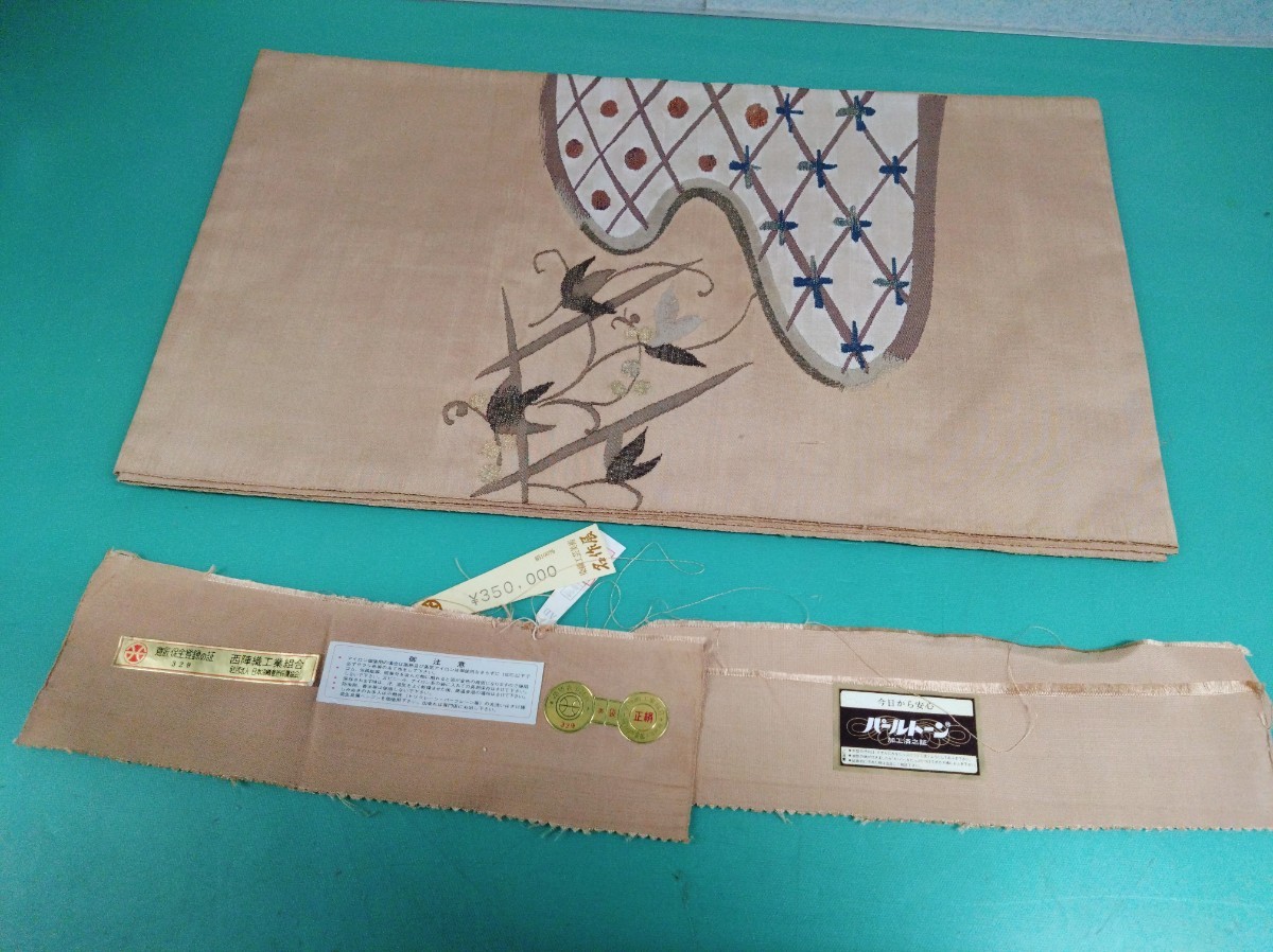 - ●川4) 【西陣 登録 329 川島織物 セルコン】【天然美】染物工芸美術 袋帯 パールトーン加工 絹100% 六通 高級 帯 定価35万円品 中古③