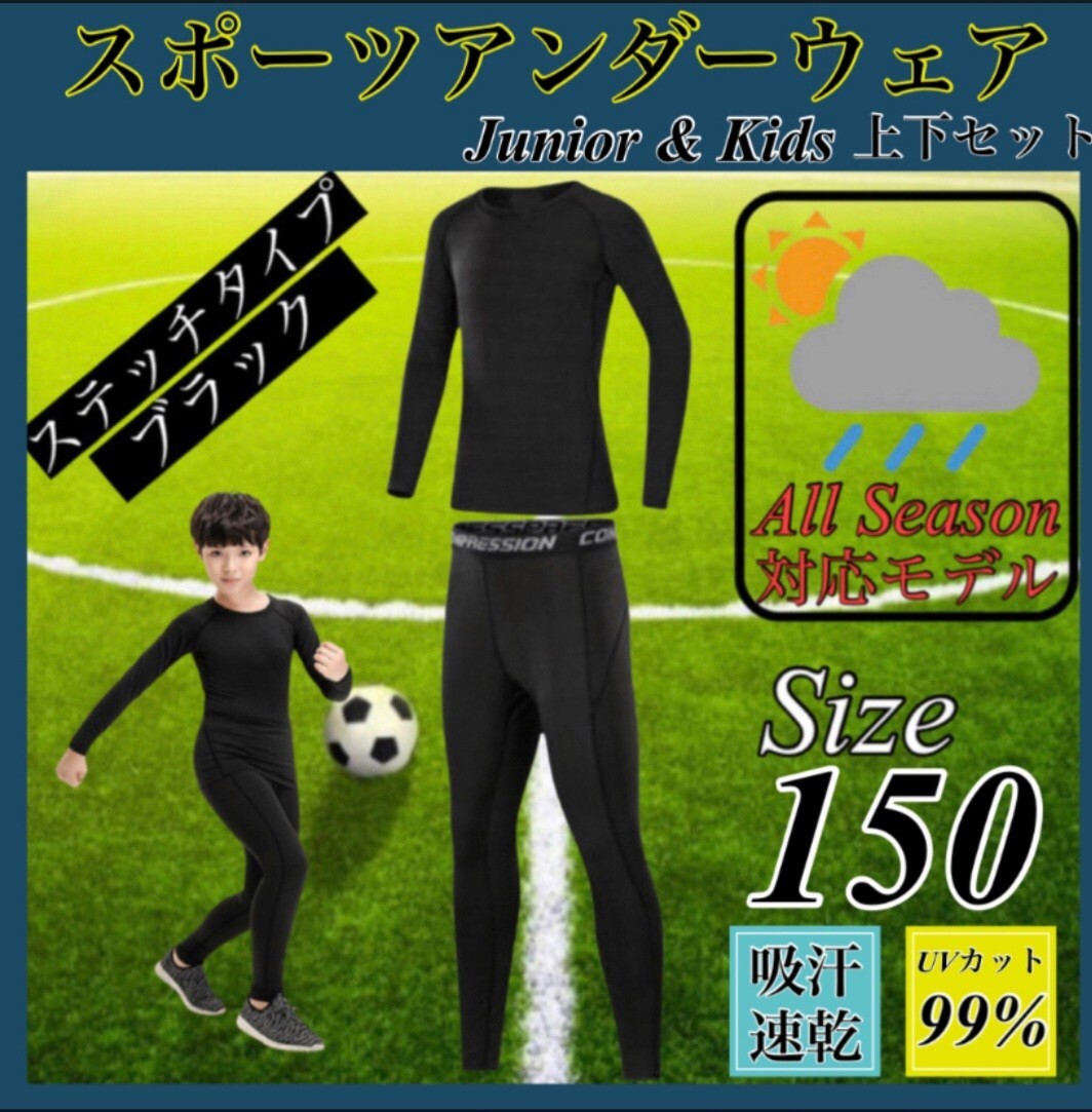 - キッズ コンプレッション スポーツ メンズ 150 セットアップ 長袖 サッカー コンプレッションウェア 加圧 吸汗速乾 黒