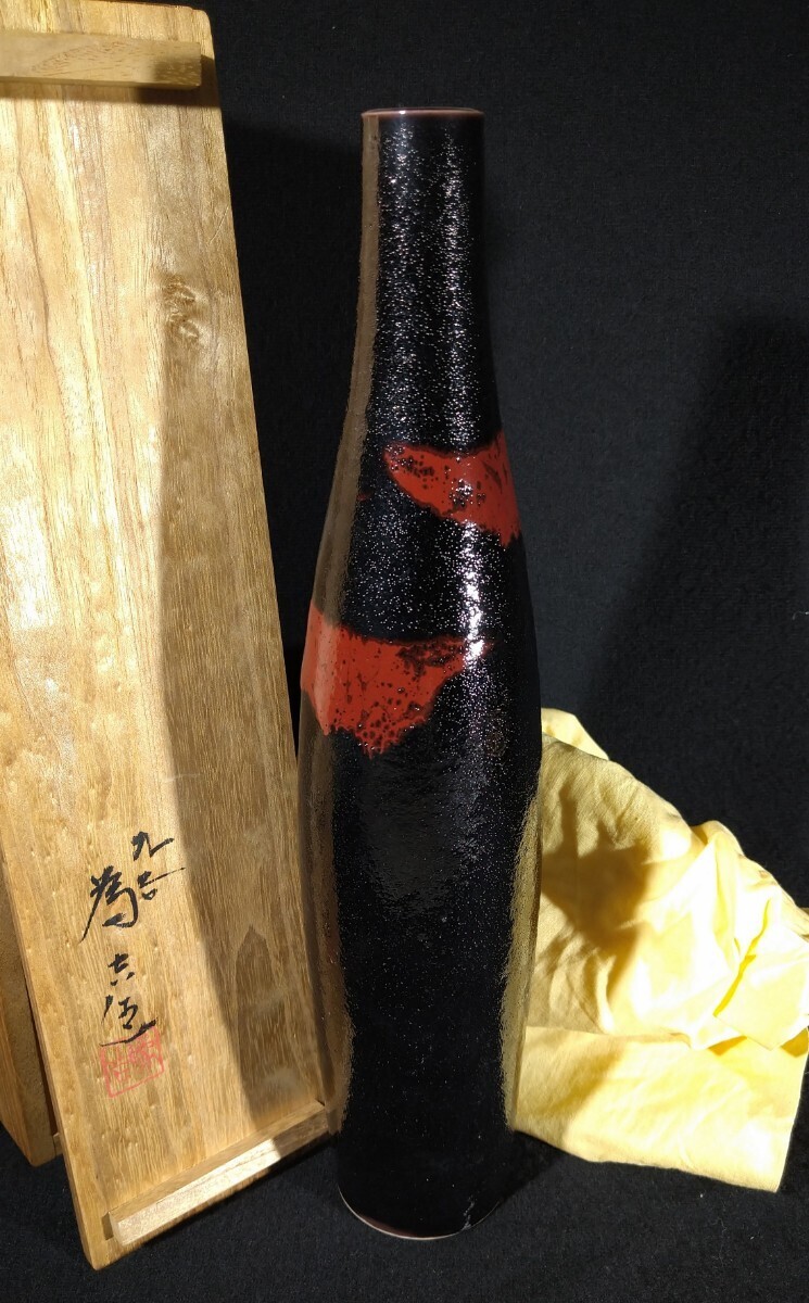 - 三ツ井為吉 「一輪生」 黒釉 30cm 一輪挿し 共箱 黄布 花瓶 花生け 花器 華道具 茶道具 九谷焼 b-14f3465