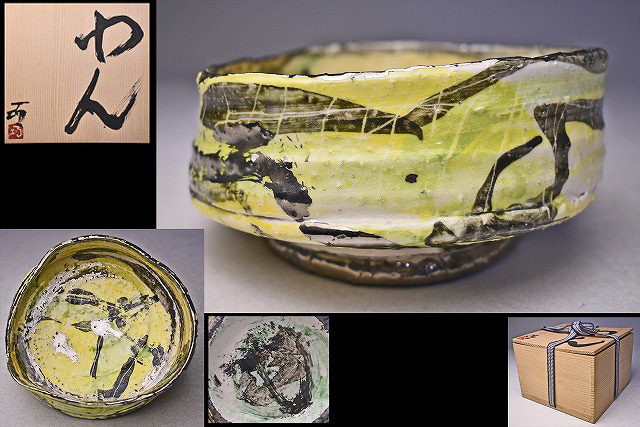 - 佐藤巧 ★ わん ★ 共箱 栞 ★ ポップアートを思わせる独特の世界観 ★ 上作 ★ 益子焼 ★ 黄色系 茶碗 茶道具 食器 ★