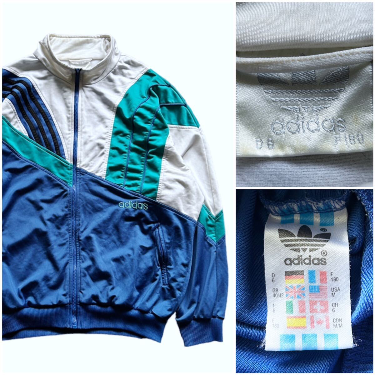 - 80’s〜 adidas アディダス ヴィンテージ トラックジャケット 白 ホワイト 青 ブルー Lサイズ相当 クレイジーパターン ジャージ 90年代