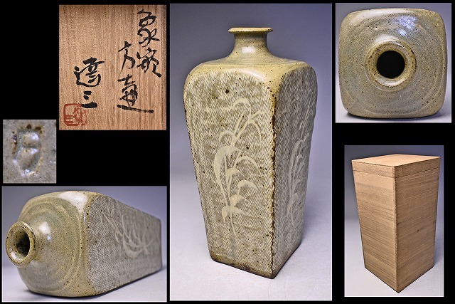 > 島岡達三★ 象嵌 方壺 ★共箱★人間国宝★ 師:浜田庄司 ★ 力強く高麗青磁を思わせる意匠 ★ 華道具 花器 花入 ★ 検 ゲルトクナッパー