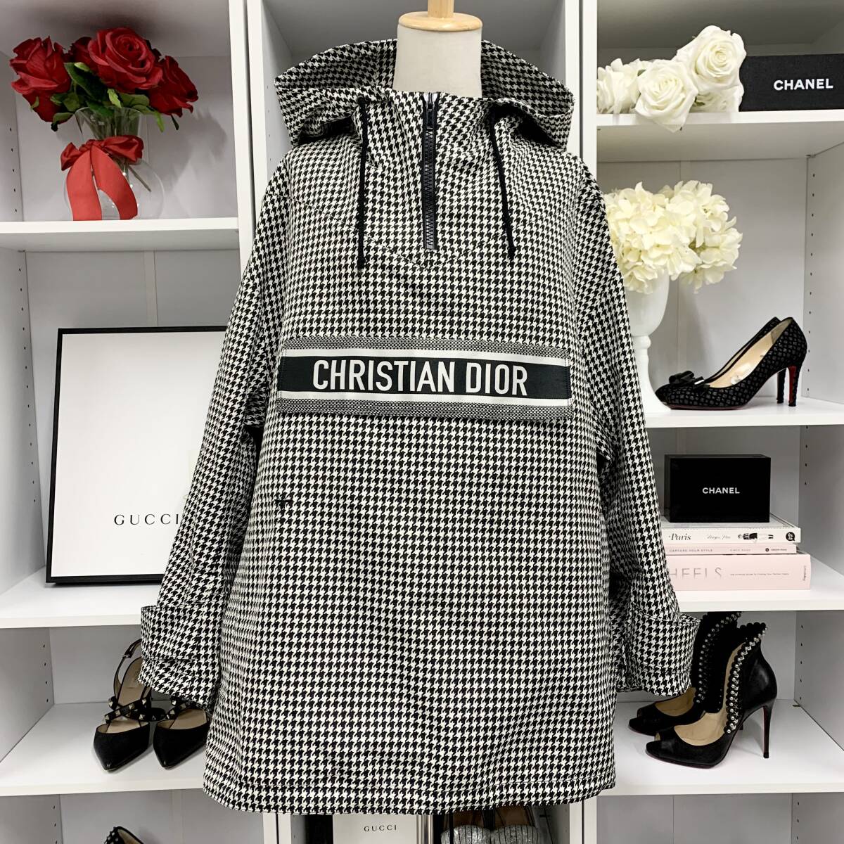 - 9338 クリスチャンディオール アノラック ロゴ ハーフジップ パーカーフーディ トップス 千鳥格子 長袖 ブラック ホワイト