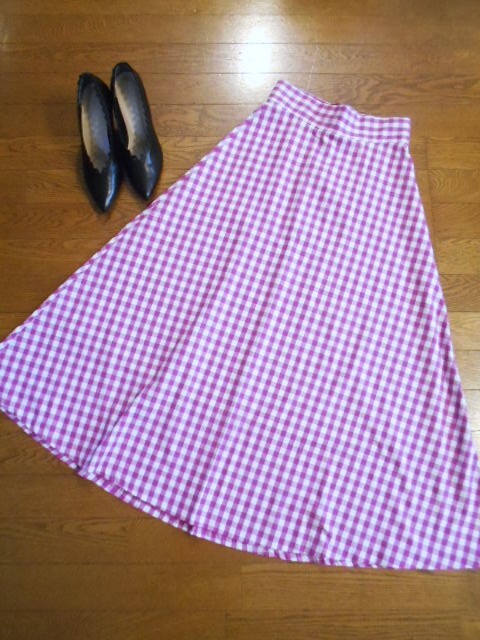 > GU・ジーユー☆コットンブレンド♪キュートなローズピンクチェックのロングフレアースカート S 良品