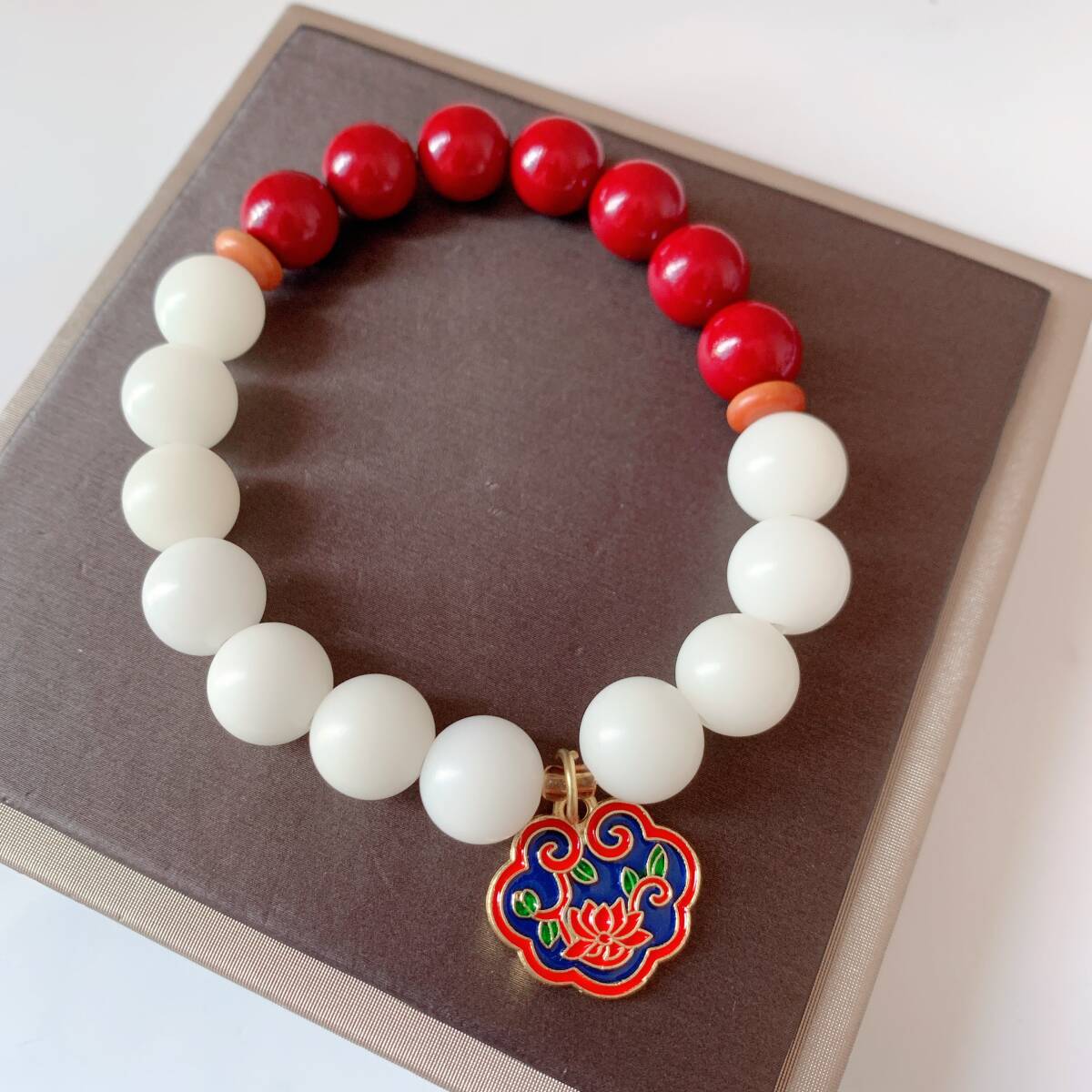> ◇菩提樹の根◇白玉菩提+シナバー(辰砂)◇ブレスレット◇数珠◇念珠◇巾着袋つき◇プレゼントにも027B32201