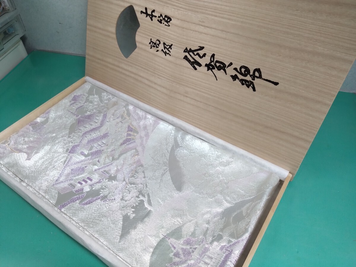 - ●164【本箔 高級 佐賀錦】桐箱入 900織 佐賀錦 刺繍 パープル プラチナ ゴールド シルバー 城 松 梅 花 高級 袋帯 六通 帯 縁起物 美品 ③