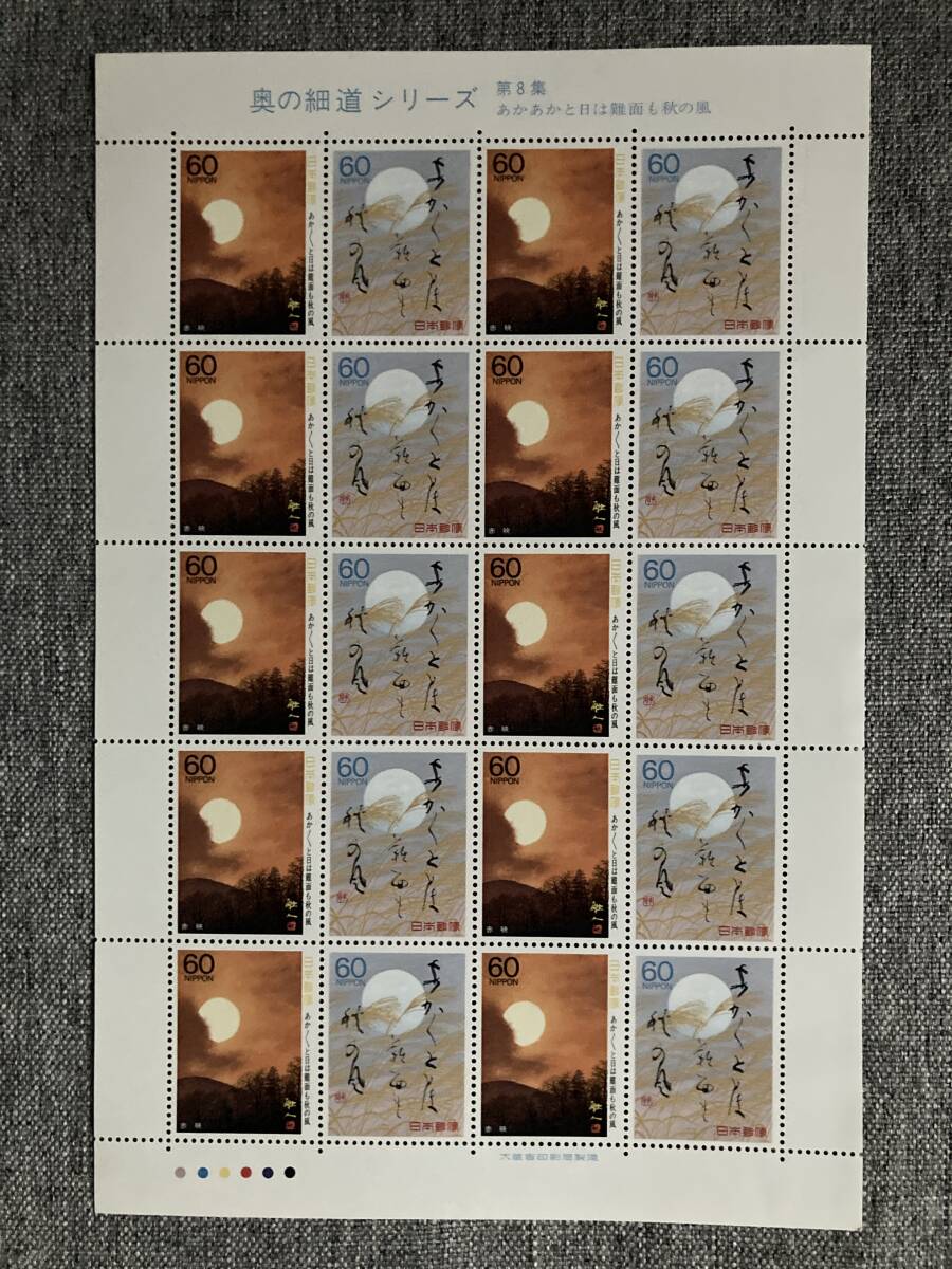 > ★未使用 奥の細道シリーズ 第8集 赤映 句の書 あかあかと 日は難面も 秋の風 松尾芭蕉 昭和63年 1988年 2種連刷 切手シート 60円20枚