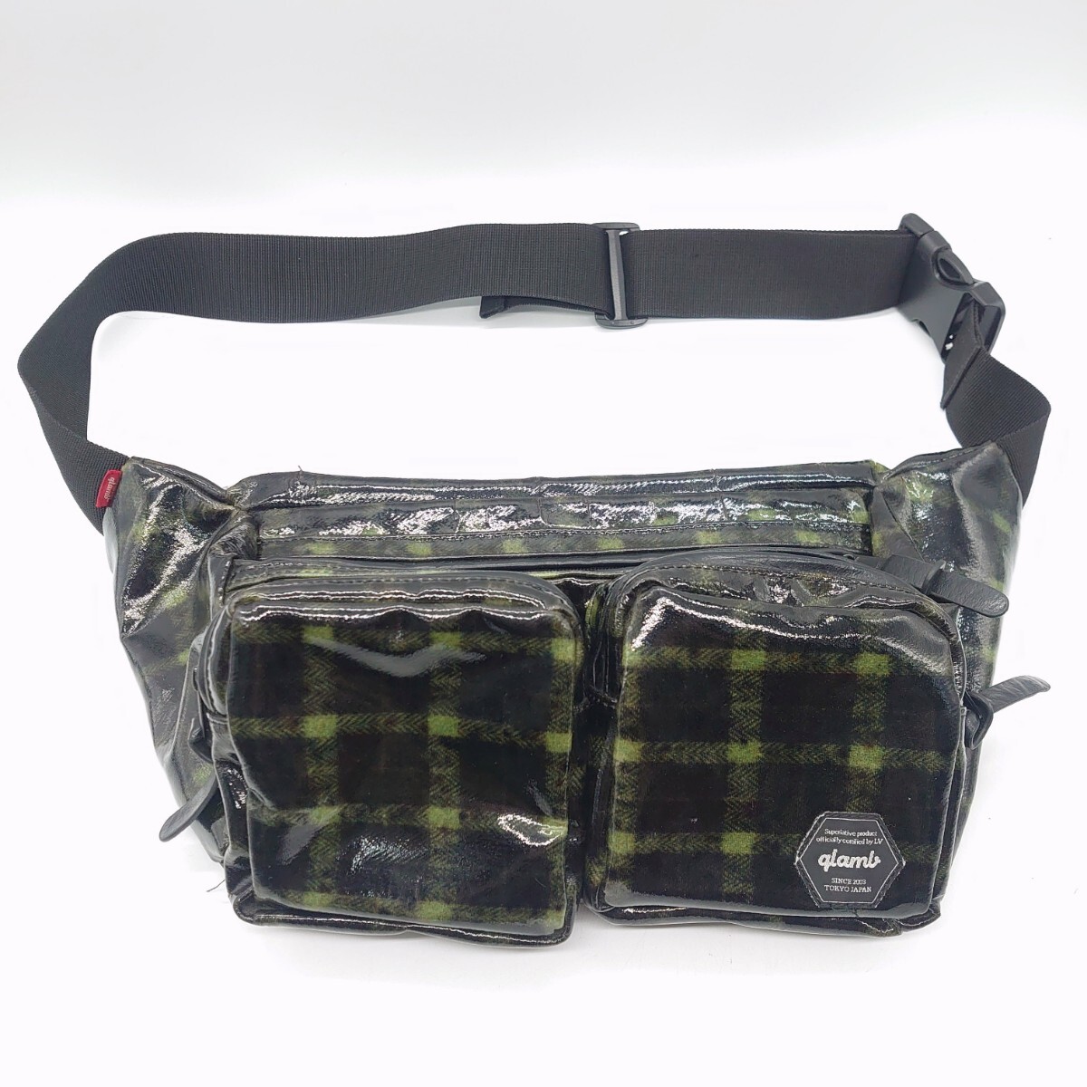 - glamb グラム メンズ ボディバッグ ウエストポーチ ショルダーバッグ レザー コーティング ブラック グリーン チェック ロゴ tp-24x255