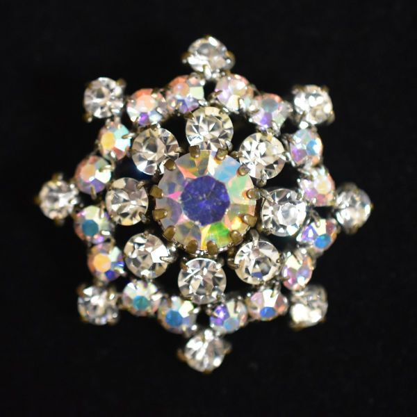 - フランスより ヴィンテージ 桃色オーロララインストーンとクリアラインストーンのフラワーブローチ 高品質 高彩度