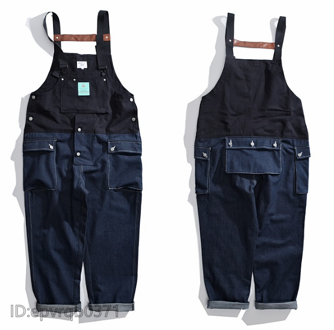 > オーバーオール サロペット メンズ デニムパンツ つなぎ オールインワン 紳士 ワークパンツ 配色 ゆったり ネイビー/Lサイズ