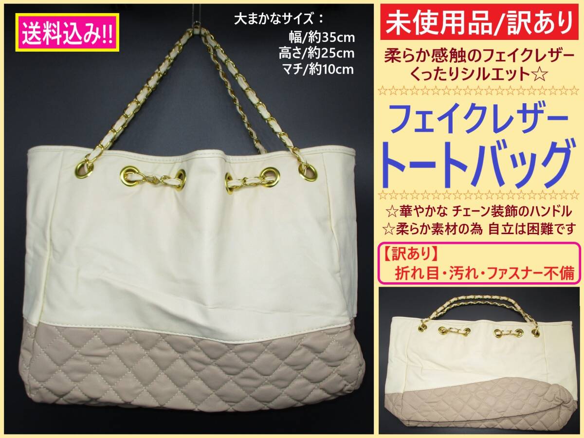 > 訳あり 未使用 柔らかい フェイク レザー トート バッグ ベージュ 白 折れ目 汚れ ファスナー不備 合皮 PU素材 くったり ツートーン 海外製
