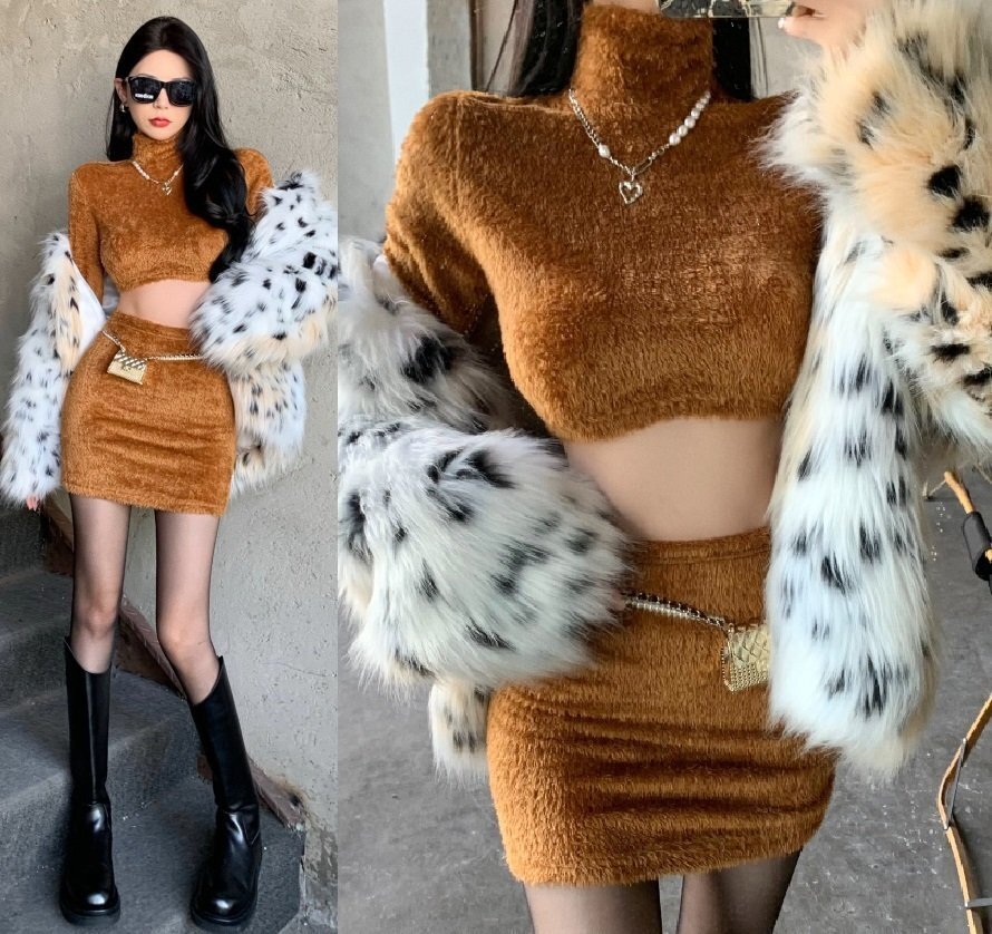 - 新品 良質 ふわふわ トップス + タイト ALL ファー 2点 セットアハイネック スカート ップ タートルネック LA1302