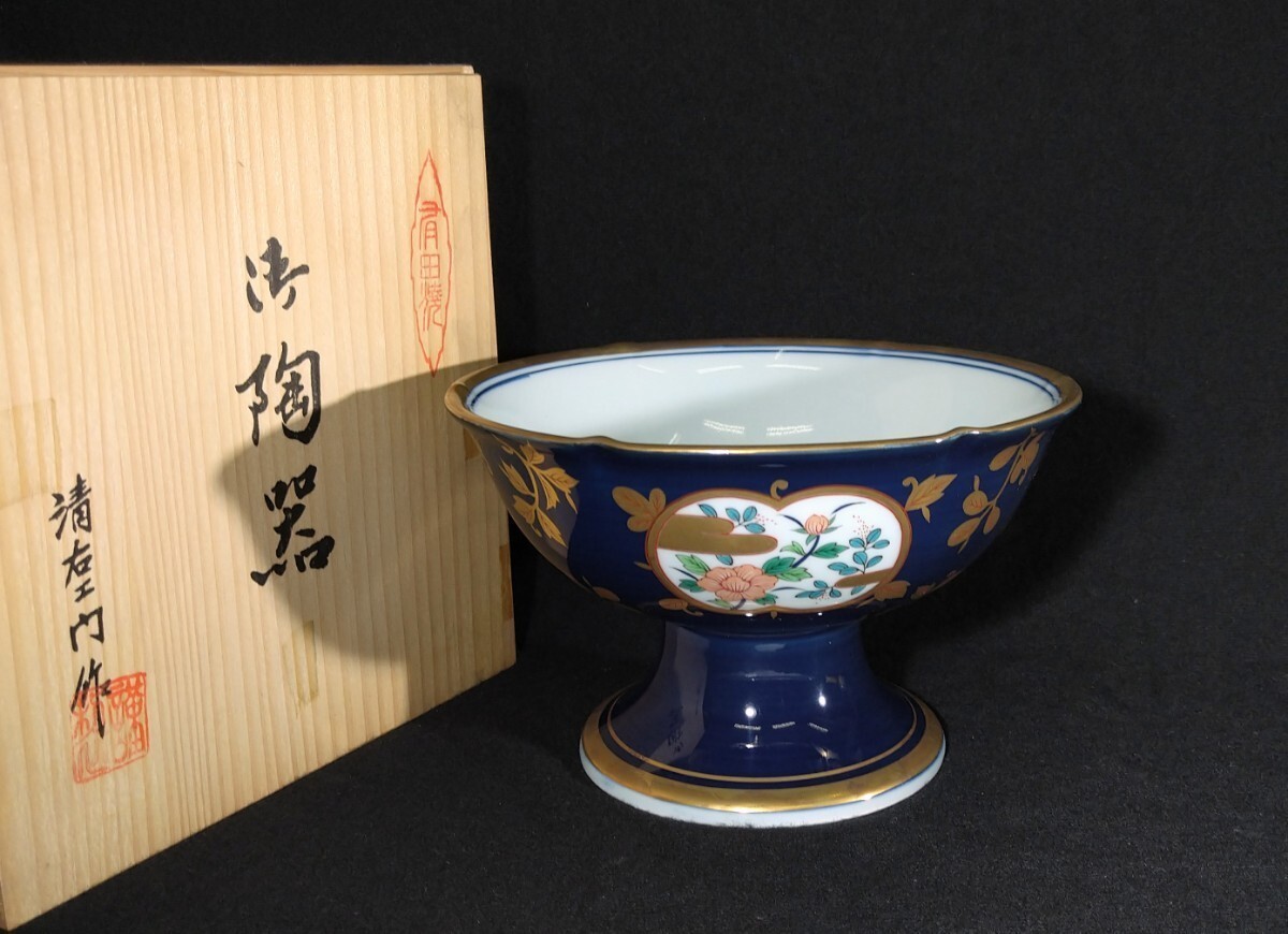 > 年木田清右衛門 「御陶器」 染付 金彩 色絵 花文 18cm 盃洗 共箱 清九窯 有田焼 b-31b3084