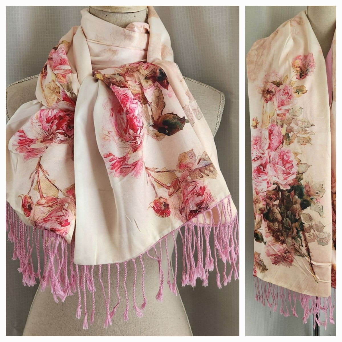 - 大変美品 写実的バラ柄の大判シルクストール フリンジ