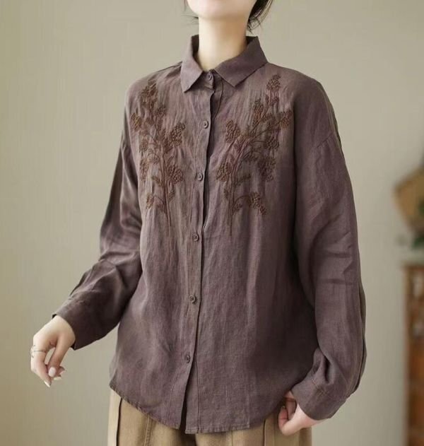 - LB466 カジュアル風 綿麻 チュニック 刺繍入り トップス レディース シャツ ブラウス 長袖 大きいサイズ 長袖シャツ ゆったり コーヒー