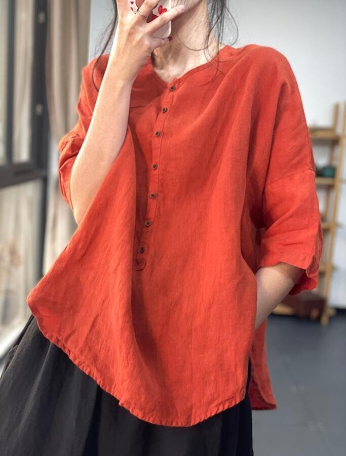- LB100 カジュアル 綿麻 シャツ ブラウス チュニック 素敵な 純色 七分袖 リネン シャツ 着痩せ 30代40代50代 ゆったり レッド