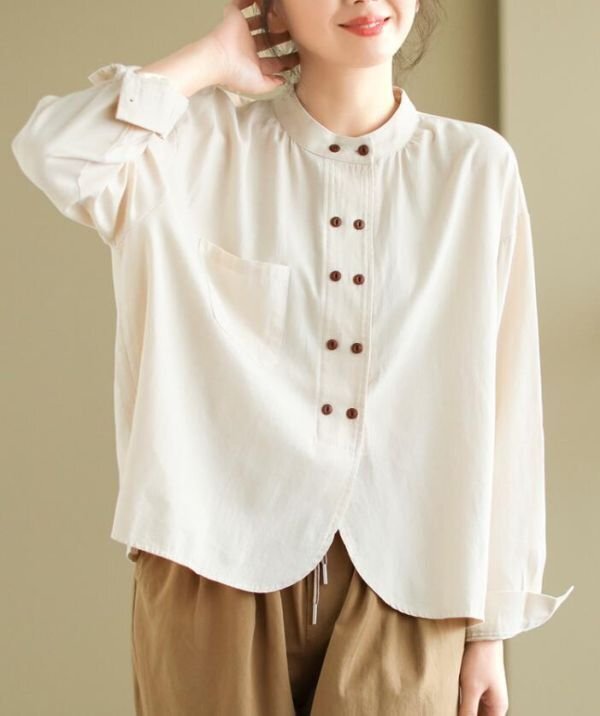 - LB572 カジュアル シャツ チュニック 長袖 ブラウス 大人 コットン レディース シャツ 杏 XL