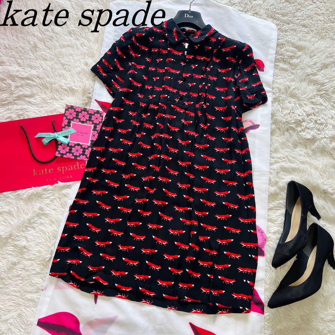 > 【良品】kate spade 総柄ワンピース ブラック キツネ 半袖 襟 4 ケイトスペード L 黒 狐 きつね フォックス シャツワンピース