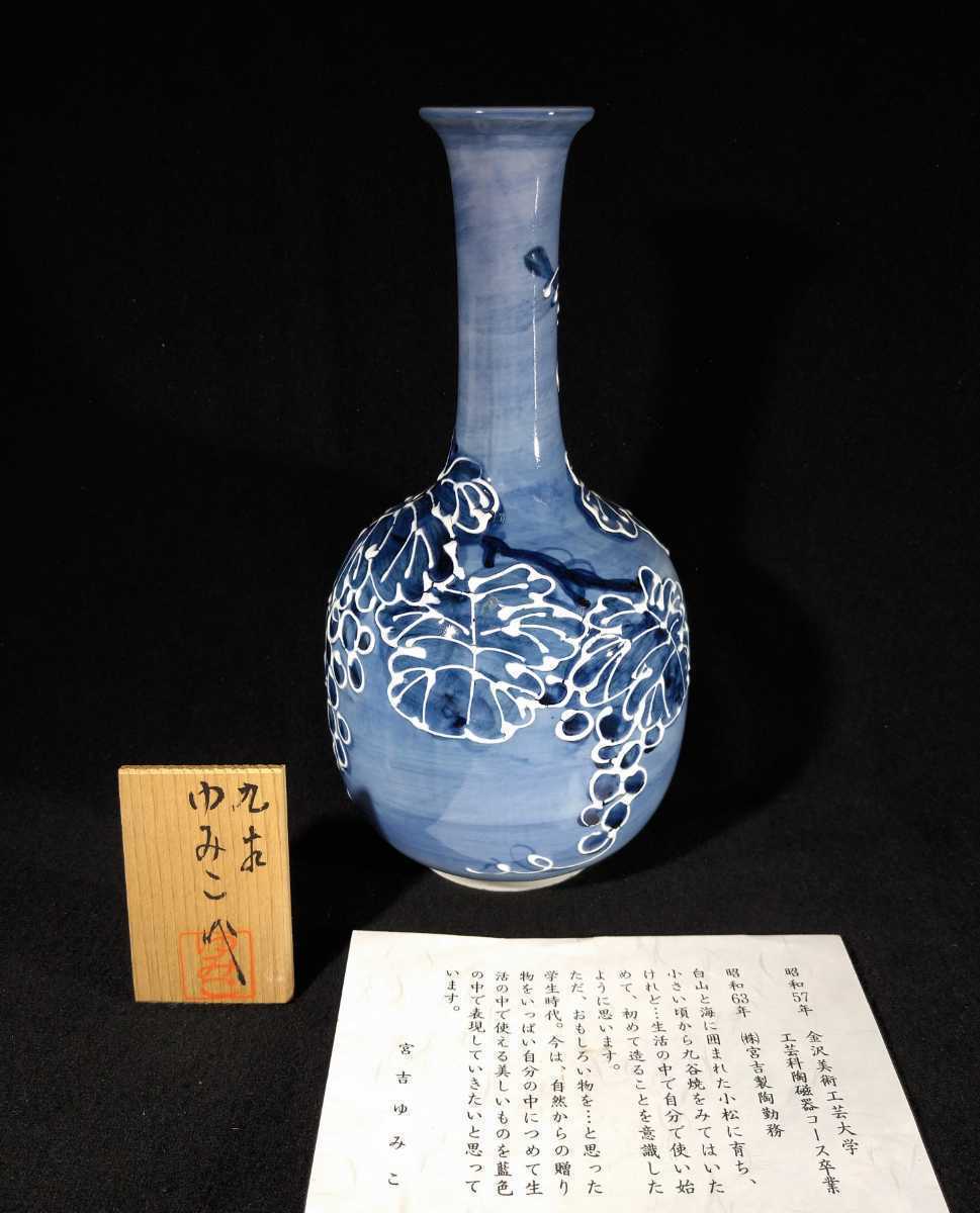 > 宮吉ゆみこ 「つたブドウつる首花瓶」 染付 果実文 24cm 花生 花瓶 九谷焼 花道具 茶道具 華道具 宮吉由美子 bm-40k745