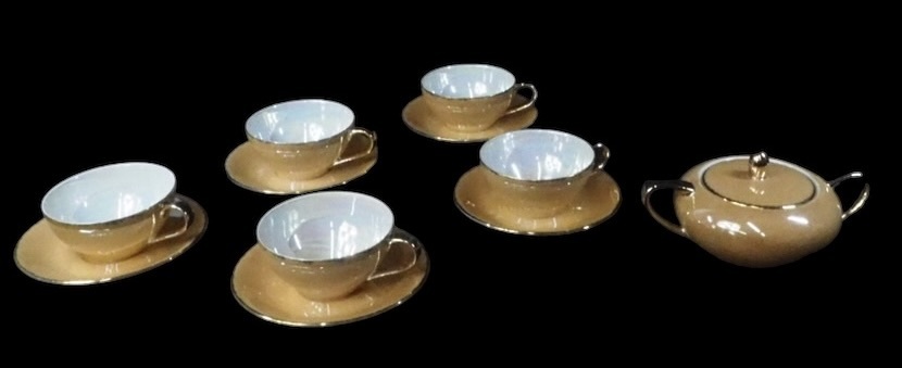 - 昭和ビンテージ セーエー陶器 金縁金彩ラスター彩シュガーポットとカップ&ソーサー5客 Seyei China 瀬栄陶器 箱無し1970〜1980年代 KKY604