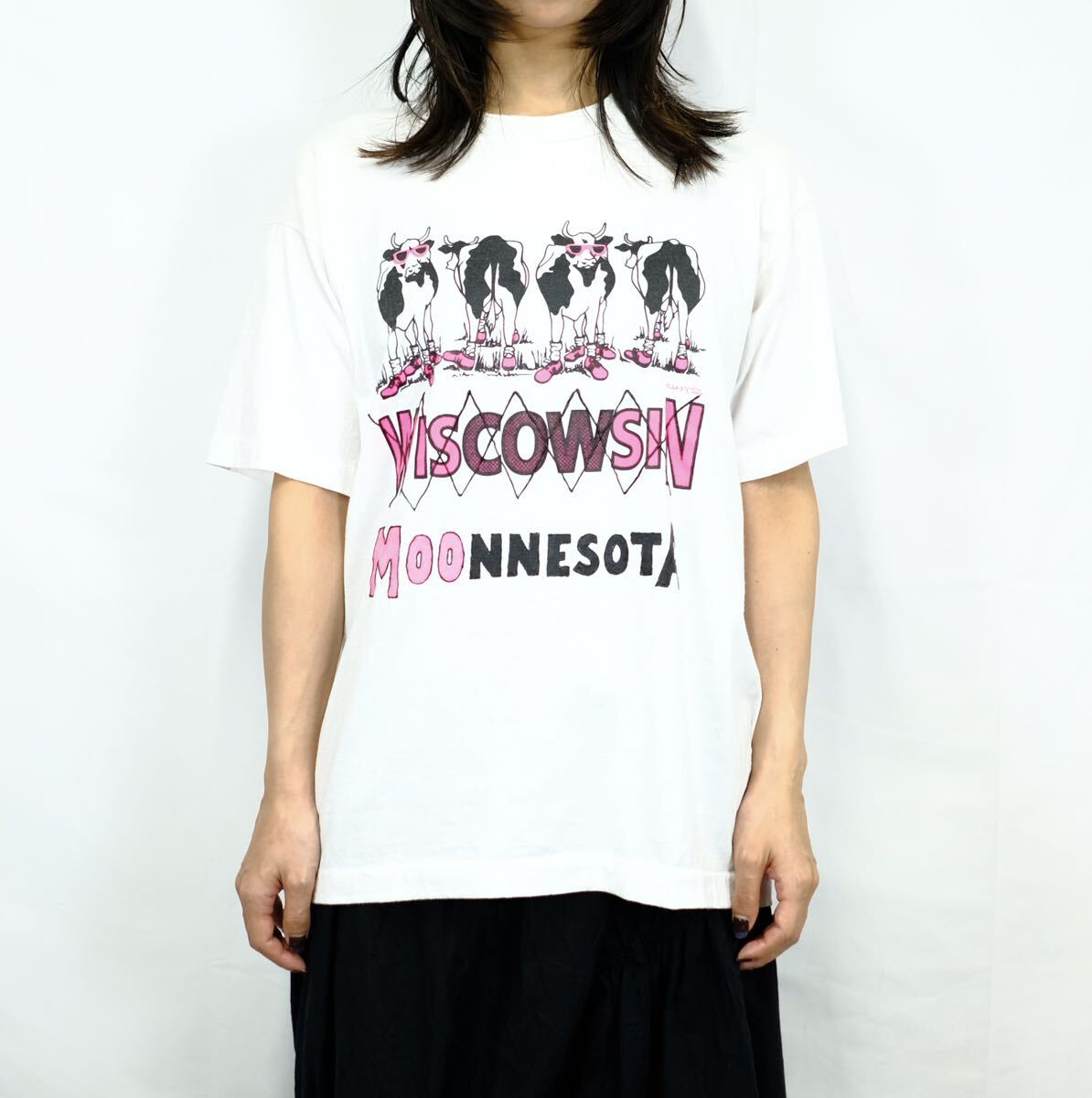> 【1990s】ビンテージ 牛柄デザイン USA製 白Tシャツ 古着屋 半袖 イラスト アート デザイン 動物 海外仕入れ