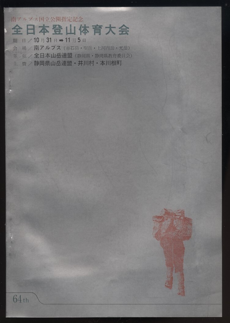 - 全日本登山体育大会パンフレット1冊 南アルプス国立公園指定記念 昭和39年 会場:南アルプス 赤石岳聖岳 上河内岳光岳 全日本山岳連盟主催
