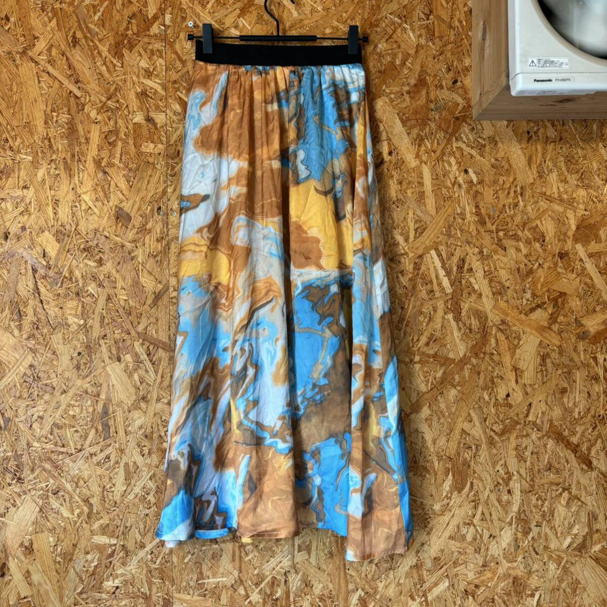 > 美品 eoab 総柄 ロングスカート ウエストゴム スカート ボトムス 派手色 サテンスカート フレア 一点物 マーブル 3148